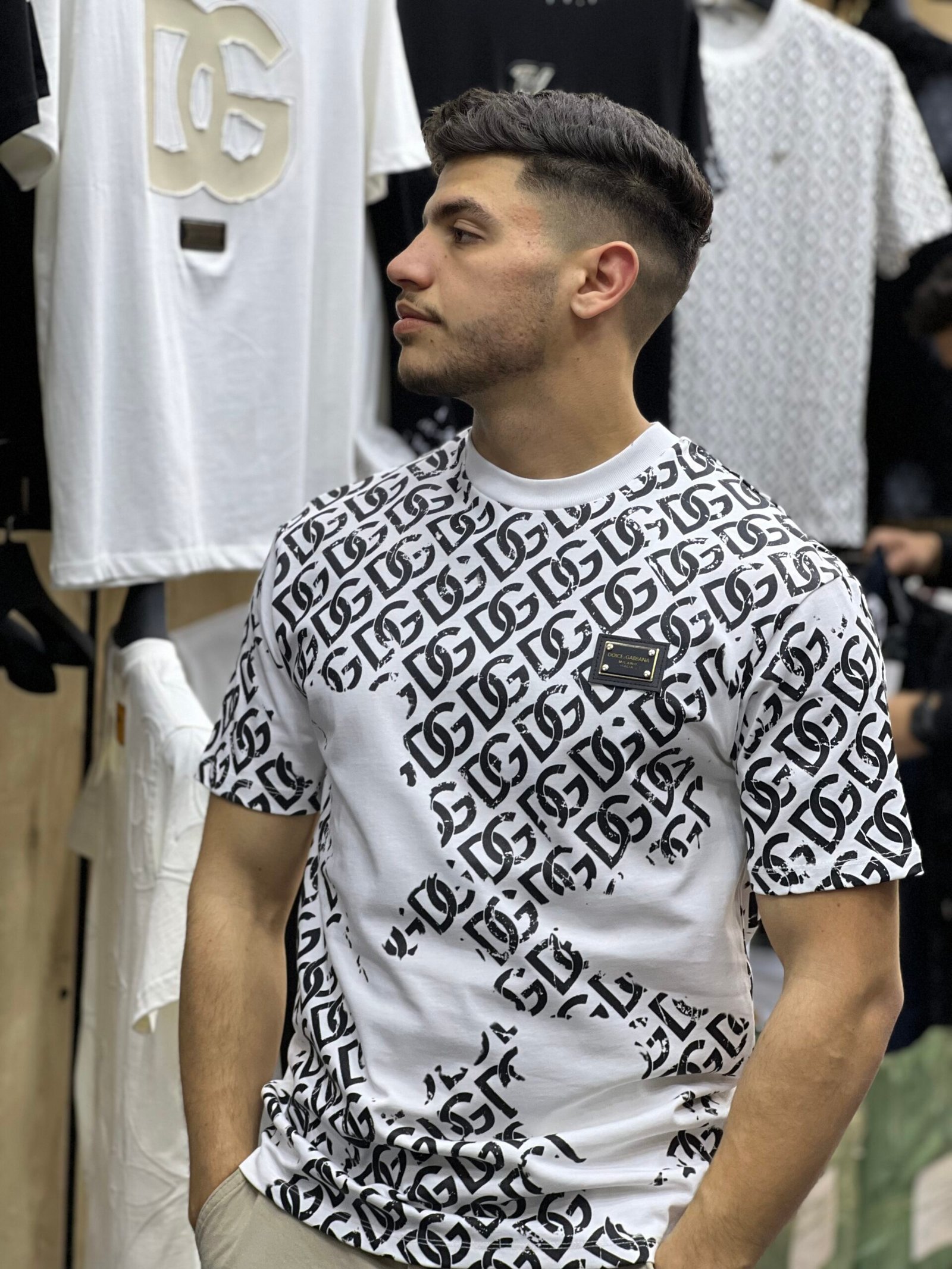 تميّز بإطلالة فاخرة وجريئة مع هذا التيشيرت من Dolce & Gabbana، المصمم خصيصًا لعشاق الأناقة العصرية. يتميز التيشيرت بنقشة D&G المكررة التي تغطي القطعة بالكامل، مما يمنحها طابعًا مميزًا ولافتًا للنظر. الخامة القطنية الفاخرة تضمن لك الراحة التامة طوال اليوم، كما أن القَصّة العصرية تضيف لمسة من الجاذبية إلى إطلالتك الكاجوال.