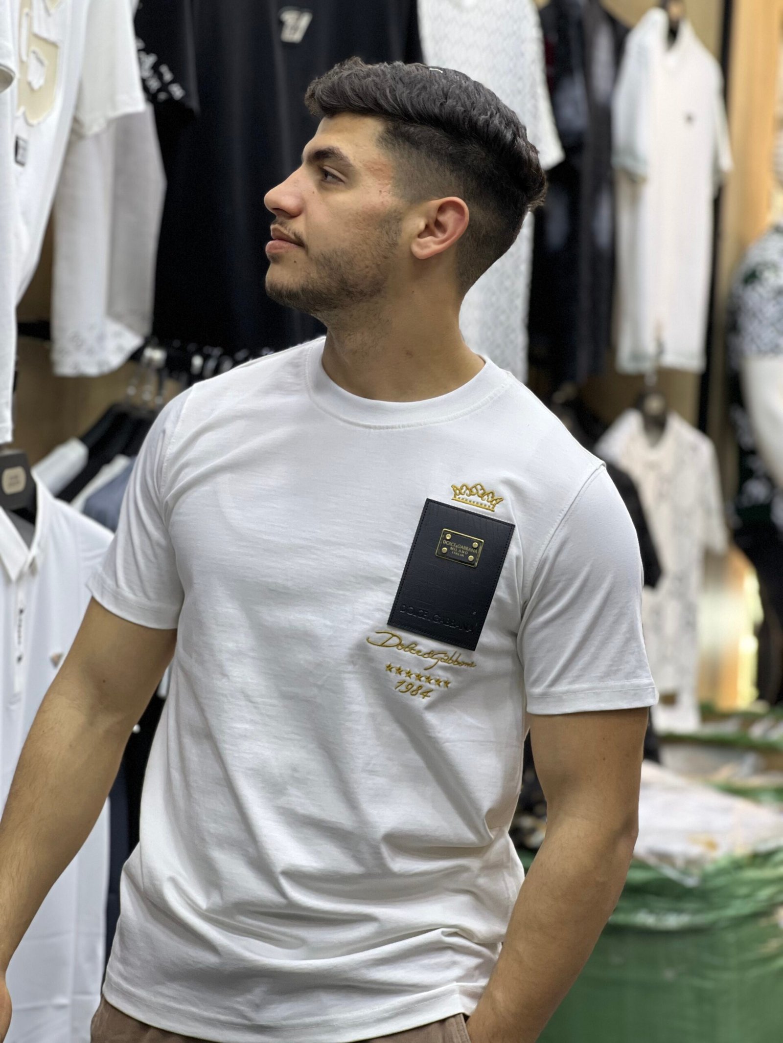 أضف لمسة من الفخامة والتفرد إلى إطلالتك مع هذا التيشيرت الأبيض الأنيق من Dolce & Gabbana. يتميز بتصميم فريد مع تفاصيل ذهبية ملكية تضفي لمسة من الرقي والتميز. مصنوع من أجود الخامات ليمنحك الراحة والأناقة في آن واحد. قطعة مثالية للرجل الذي يقدر التفاصيل الفاخرة.