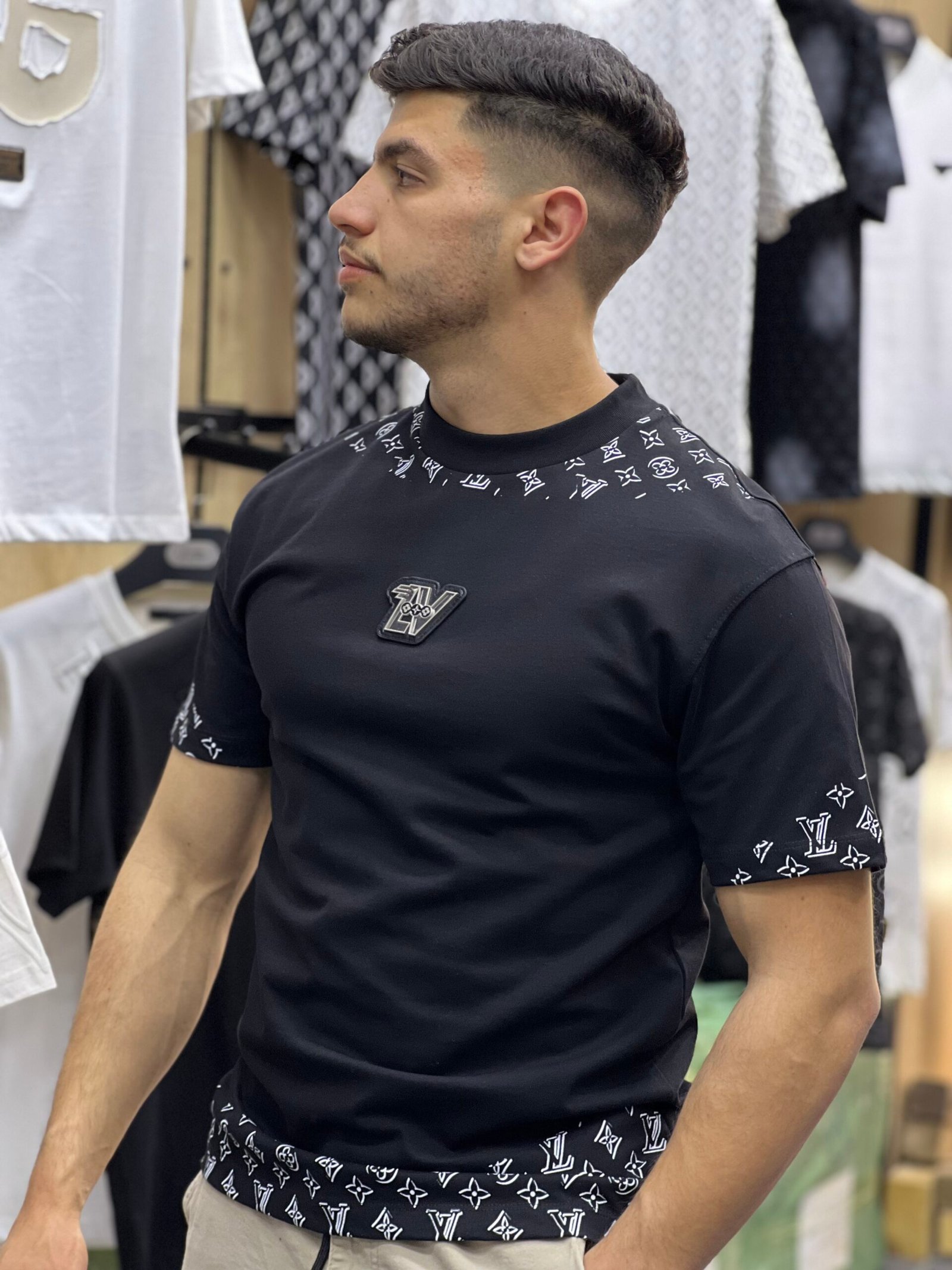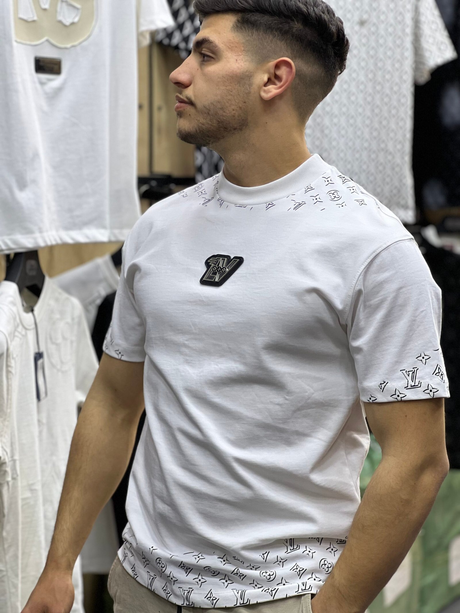 على الأكمام والياقة والحافة السفلية.LV مزين بطبعات شعار